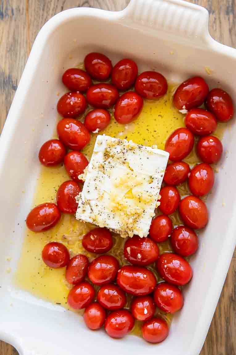 - Place the feta block in the center of a 9×13” casserole dish and surround it with the tomatoes.