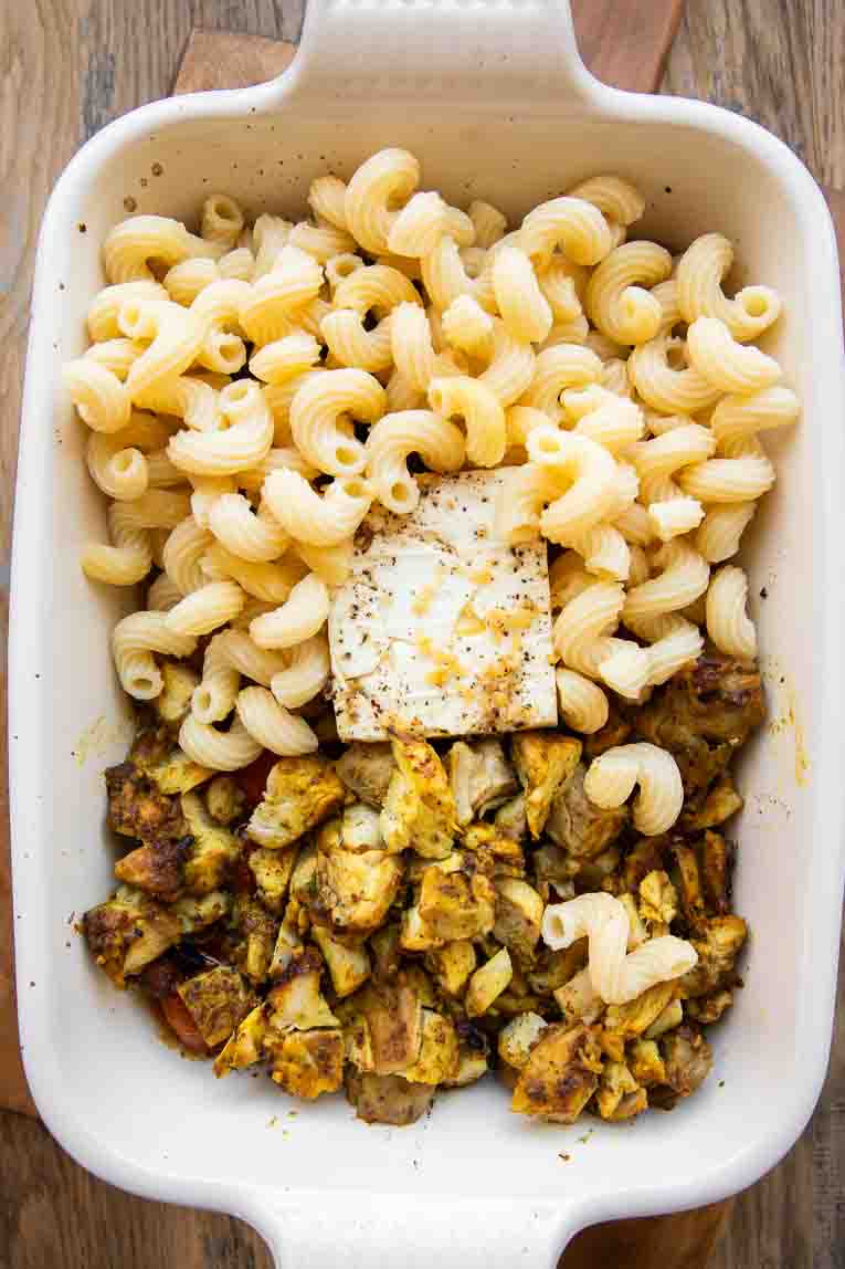 This Mediterranean chicken bake couldn’t be easier to prepare! All you need is a casserole dish, a large pot, and a colander. Here’s how to make a Mediterranean Feta Chicken Bake: