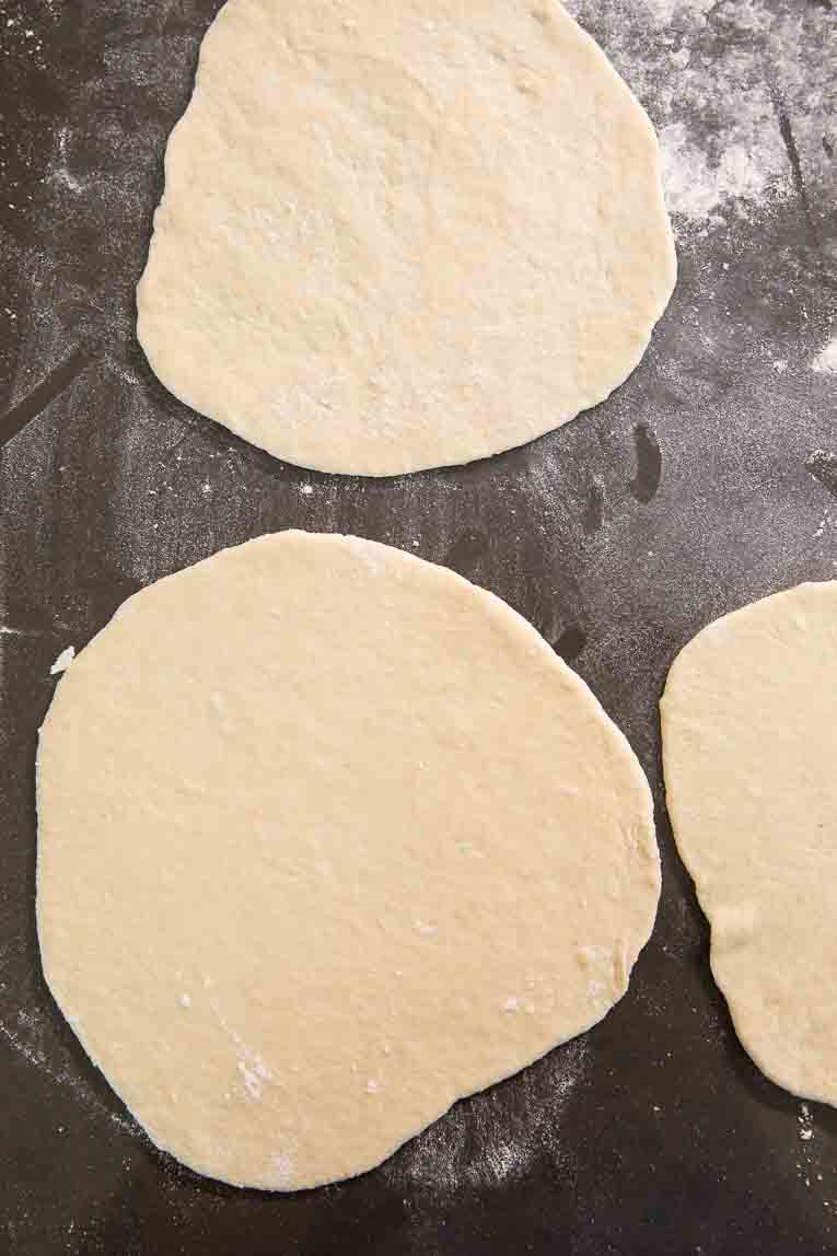 - Take one portion of dough and sprinkle it with flour. Be sure to also sprinkle your rolling pin with flour to prevent sticking. Roll the dough into a roughly 6-inch circle. Set the rolled dough aside onto your floured counter, then repeat the rolling process with remaining dough.