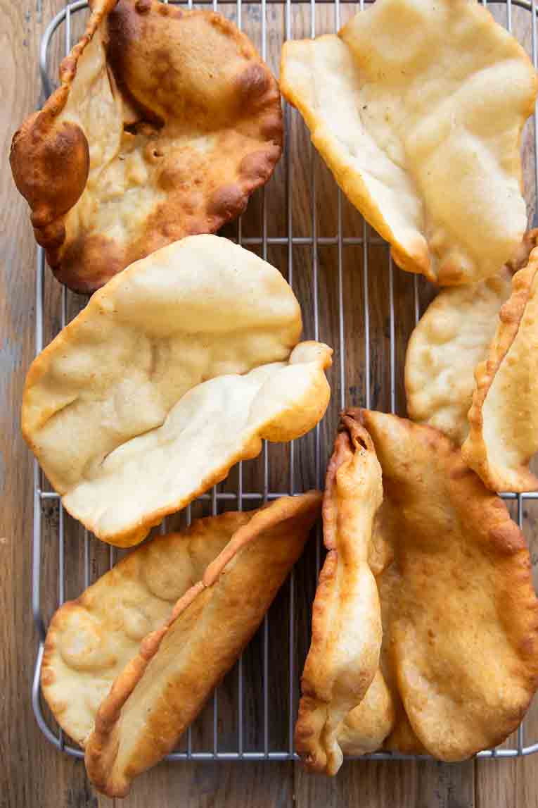 - Fry the chalupas – Next, heat oil in a large, heavy-bottomed pot. While the oil heats, divide the dough into 8 equal-sized pieces. Working with one piece at a time, roll the dough into a circle. Add one dough round to the oil, and cook on both sides. Then, very carefully, use tongs to fold the bread in half, and hold it in the oil to help it set. Transfer the cooked chalupa shell to a paper towel-lined plate, and repeat with the remaining dough.