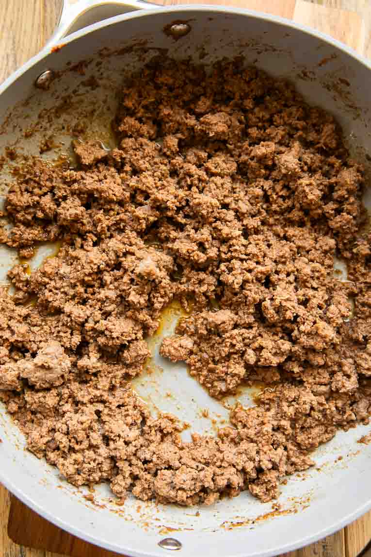 - Make the taco meat – Heat oil in a separate skillet, and cook the beef, breaking it into pieces, until it’s no longer pink. Add the remaining ingredients, and simmer until the meat is fully cooked through and slightly thickened, stirring occasionally.